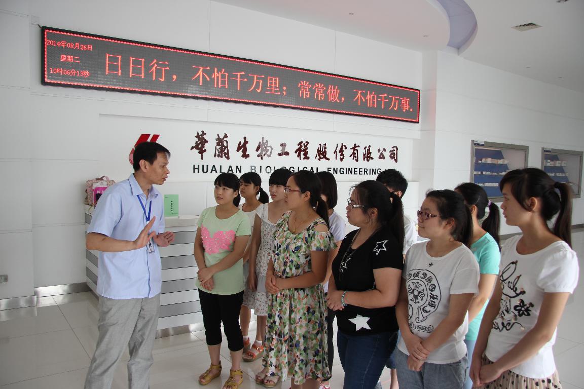 为了让师生们更好地将学习和实践结合在一起,省血液中心李伍升处长和检验系李妍老师带领12级输血检验班学生于2014年8月26日赴新乡华兰生物公司参观学习。